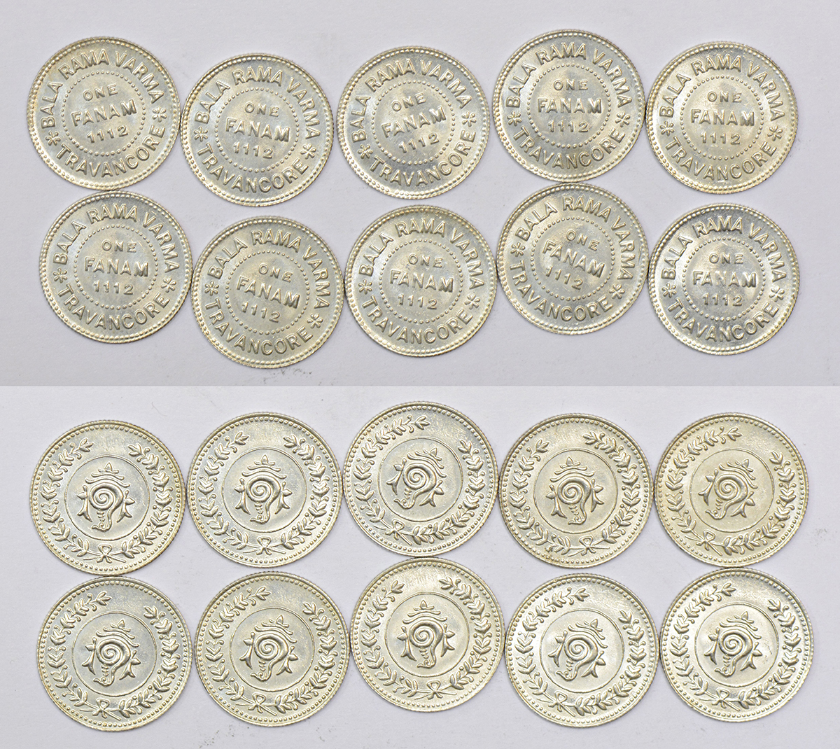 A group of 10 Travancore State silver fanam, all Bala Rama Varma II, dated ME 1112. (10 coins)