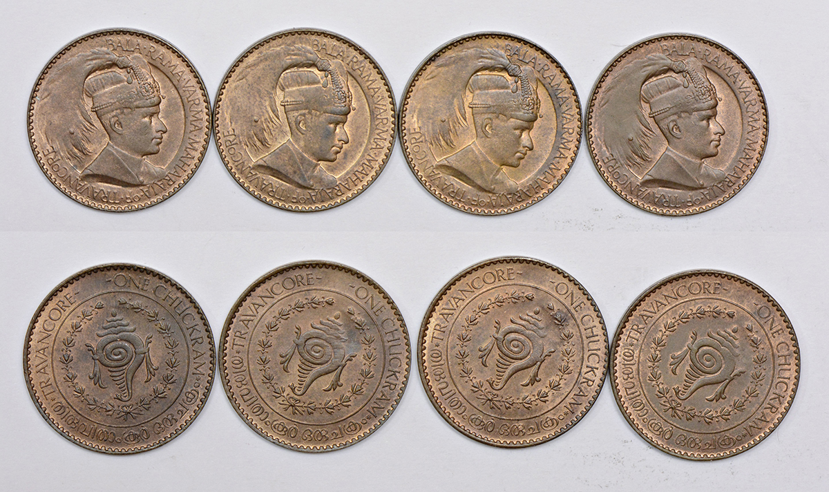 A group of 4 Travancore State error copper chuckram, all Bala Rama Varma II, die-axis. (4 coins)