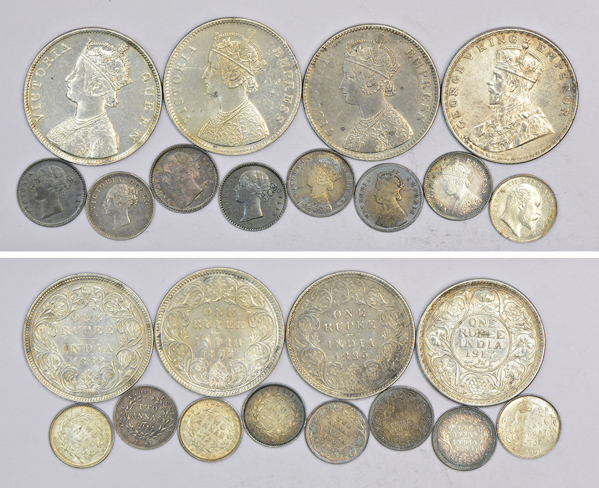 A group of 12 British India silver coins, includes 4x rupee and 8x 2 annas of Victoria Queen C.L./D.L., Victoria Queen/Empress, Edward VII and George V, various mints, dates and types. (12 coins)