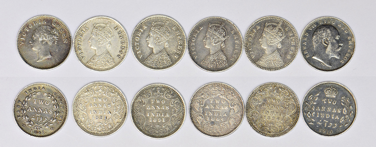 A group of 6 British India silver 2 annas, includes 1x Victoria Queen CL, 4x Victoria Empress and 1x Edward VII, various dates and types.