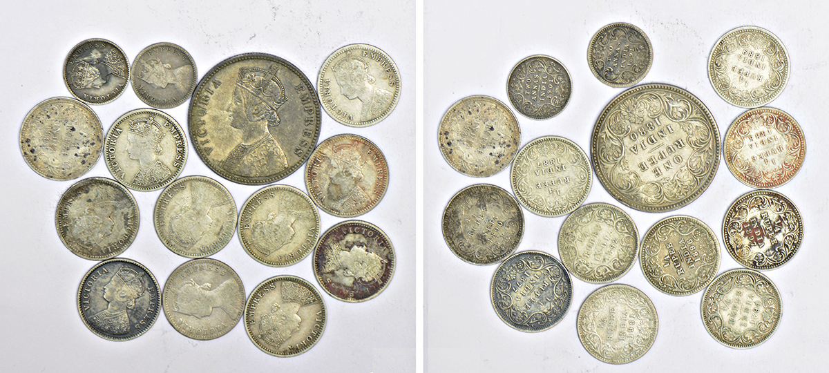 A group of 14 Victoria Empress silver coins, includes 1x rupee, 11x ¼ rupee and 2x 2 annas, various dates and types. (14 coins)