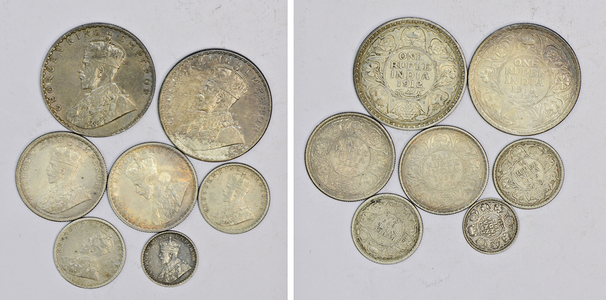 A group of 7 George V silver coins, includes 2x rupee, 2x ½ rupee, 2x ¼ rupee and 1x 2 annas, various dates and types. (7 coins)