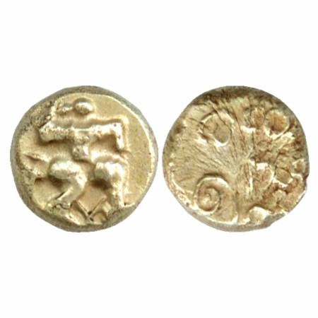 Yadavas of Devagiri, Krishnadeva (1247 – 1261 AD), Gold, 3.83g, die-struck Gadyana Obv: a design composed of a lotus in the centre, a Sankha below it, two Kannada characters 'Sri' on either side and a Devanagari legend (with a spear-like object) 'Sri Kanha (ra)' above it, Rev: an archer pursuing and striking a man in his head with an arrow, traces of Devanagari inscription below.