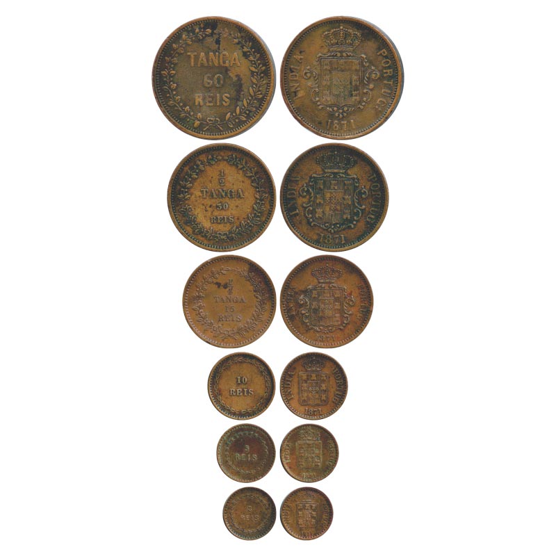 Portuguese India (6), Goa, Luiz I, Colonial Coinage, 1871, Machine Struck, Copper Tanga (60 Reis), ½ Tanga (30 Reis), ¼ Tanga (15 Reis), 10 Reis, 5 Reis and 3 Reis, (KM 306, 305, 304, 303, 302 & 301). (6 Coins)