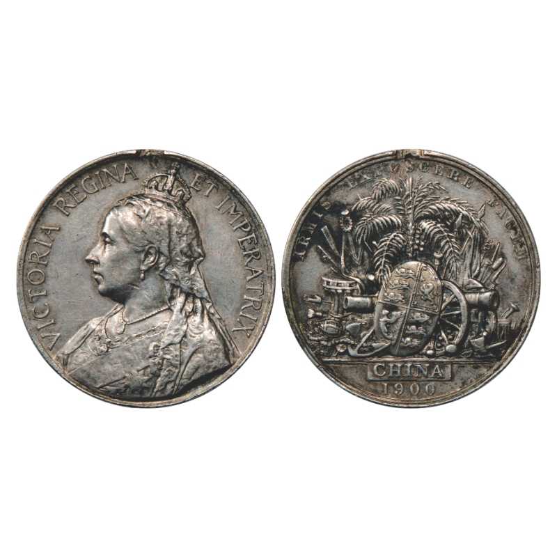 China War Medal, Victoria, Silver, 30.68g. Obv: Portrait bust of Queen Victoria. Rev: Trophy of arms, with CHINA 1900 written below.