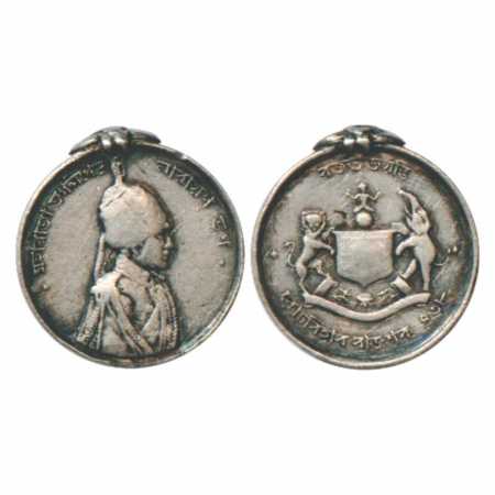 Cooch Bihar, Miniature Silver Jubilee Medal of Jagaddipendra Narayan, 4.70g. Obv: Portrait bust of King around Bengali legend Jagaddipendra Narayan Bhup. Rev: Coat of arms of the state supported by lion and elephant, Bengali legend top and bottom with date Saka 438.