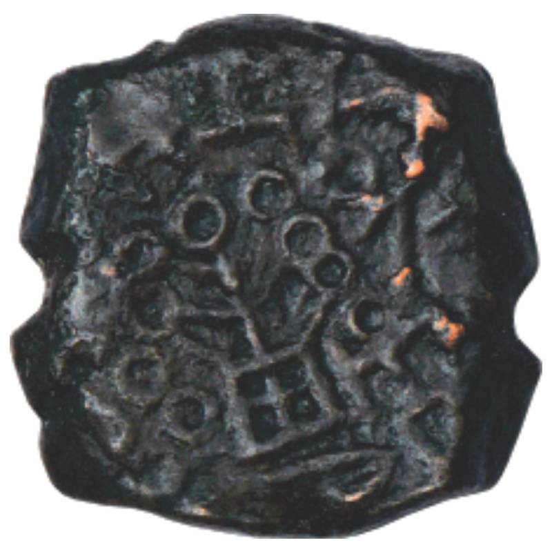 Coins of Bhumimitra are known in a few other types such as the 'seated Yogi' type, which are die-struck and have motifs on both sides. This coin is uniface and manufactured by a more simple and indigenous technique.