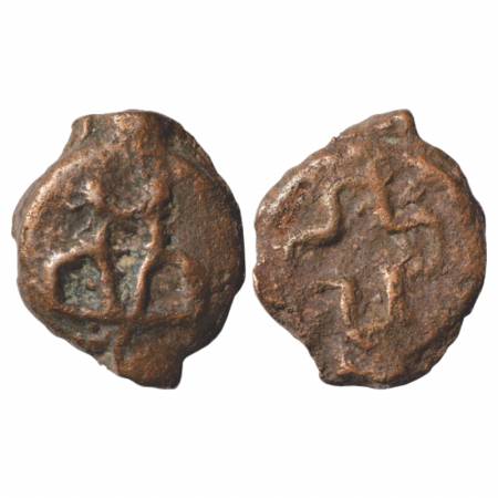Post-Mauryan, Uninscribed die struck Copper Coin of Taxila region (185-160 BC), 12.81g. Obv: Elephant walking to right. Rev: Lion facing left with Swastika above and three arched hill, MAC 4401-4403.