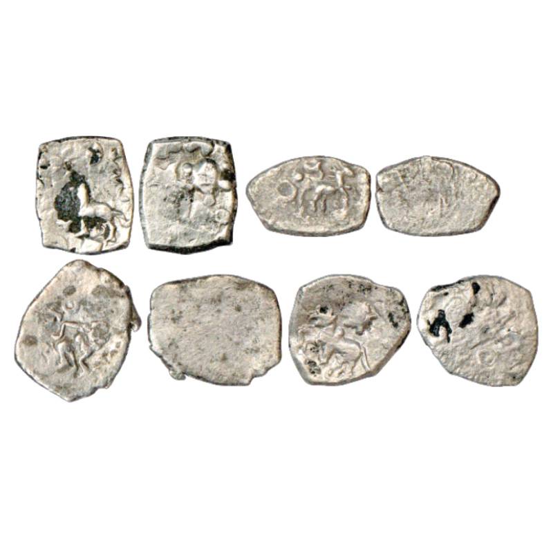Archaic Silver punch-marked coins, (350-250BC), attributed to “Surashtra Janapada” - four coins corresponding to