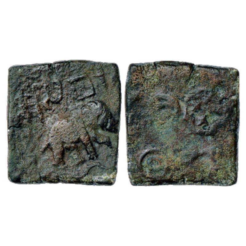 Mathura, 'Datta' rulers, c. 100 BC, die-struck Copper alloy Coin of Bhavadatta, 3.21g. Obv: Brahmi legend Bhavadatasa in bold letters in centre; stylized depiction of a goddess, possibly flanked by a three-arched hill below it and traces of other symbols above. Rev: Elephant walking to left.