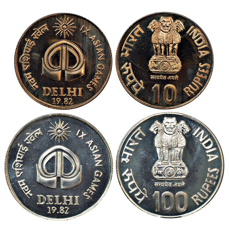 1982, IX Asian Games, UNC coins (2), cupro-nickel 10 rupees, 25.15g and silver 100 rupees (50% silver), 35g, Bombay mint, KM 197 and 278. (2 coins)