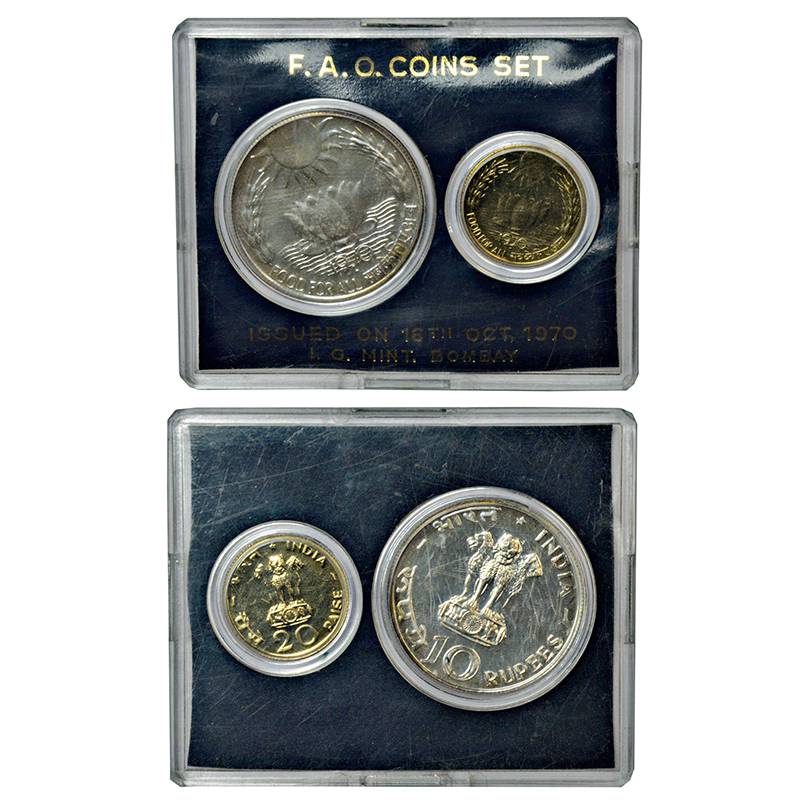 1970, Food For All, UNC set of 2 coins, 10 rupees and 20 paisa, Bombay mint, RB 24, without detail card and mint cover.