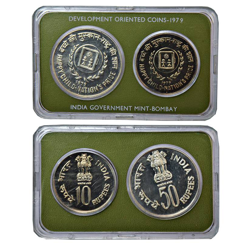 1979, Happy Child Nation's Pride, UNC set of 2 coins, 50 rupees and 10 rupees, Bombay mint, RB 74, without mint outer paper cover.