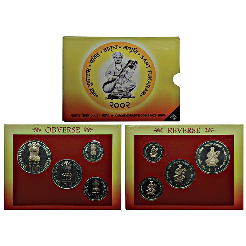 2002, Sant Tukaram, UNC set of 4 coins, 100 rupees, 50 rupees, 10 rupees and 2 rupees, Kolkata mint, in original mint packing.