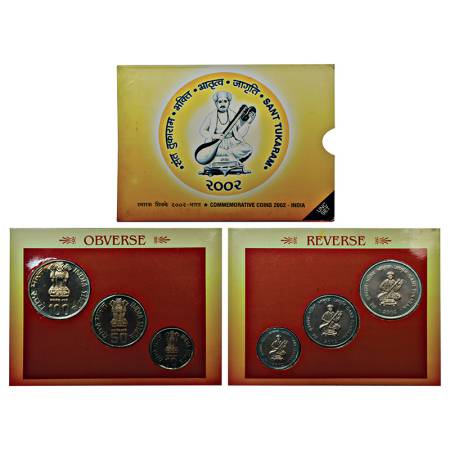 2002, Saint Tukaram, UNC set of 3 coins, 100 rupees, 50 rupees and 10 rupees, Kolkata mint, RB 249, 1st strike, in original mint packing.