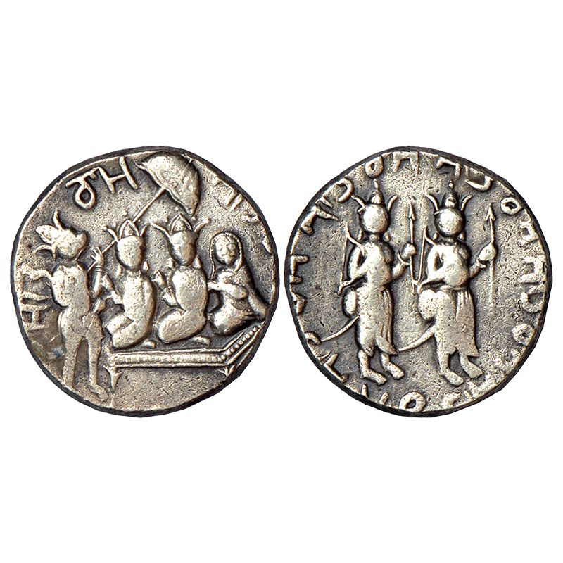 Ramatanka, mid-19th century, silver token, 11.71g. Obv: Darbar scene, Rama, Sita and their son seated on darbar platform, Hanuman standing left. Rev:Rama and Lakshmana standing.