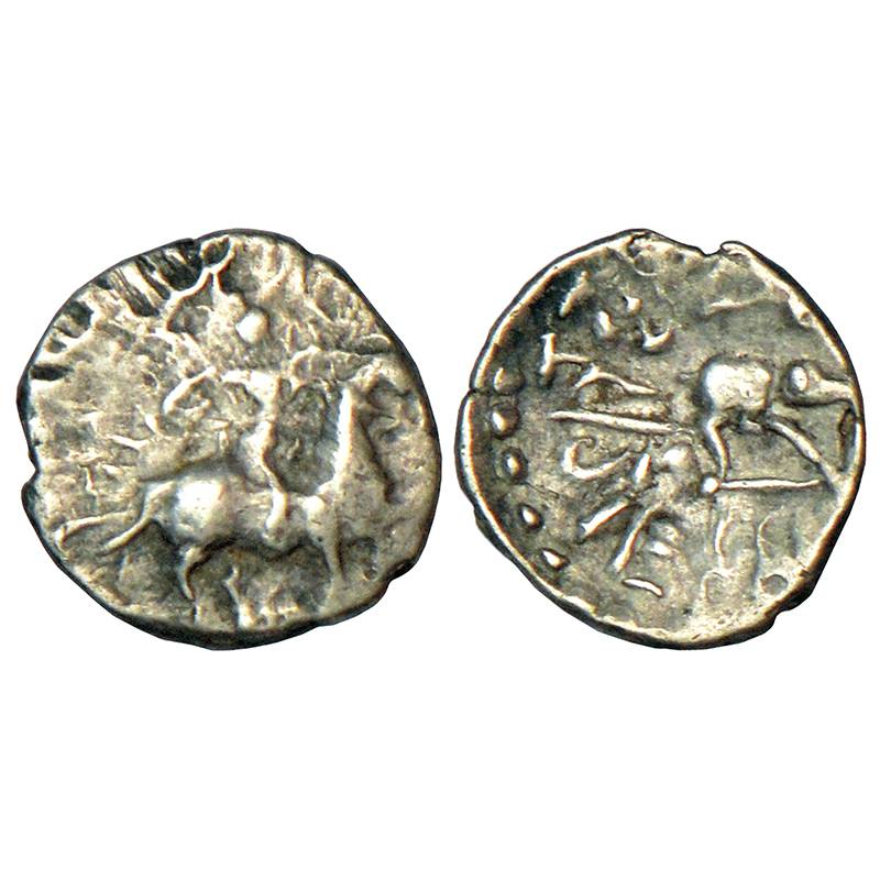 Rashtrakutas, unattributed silver dramma, (700-800 AD), unpublished in major sources, 0.49g. Obv: Horseman riding to right. Rev: Boar facing right in centre; truncated late Brahmi legend Shri Ratta… clockwise from 9 o'clock and Raja…anticlockwise.