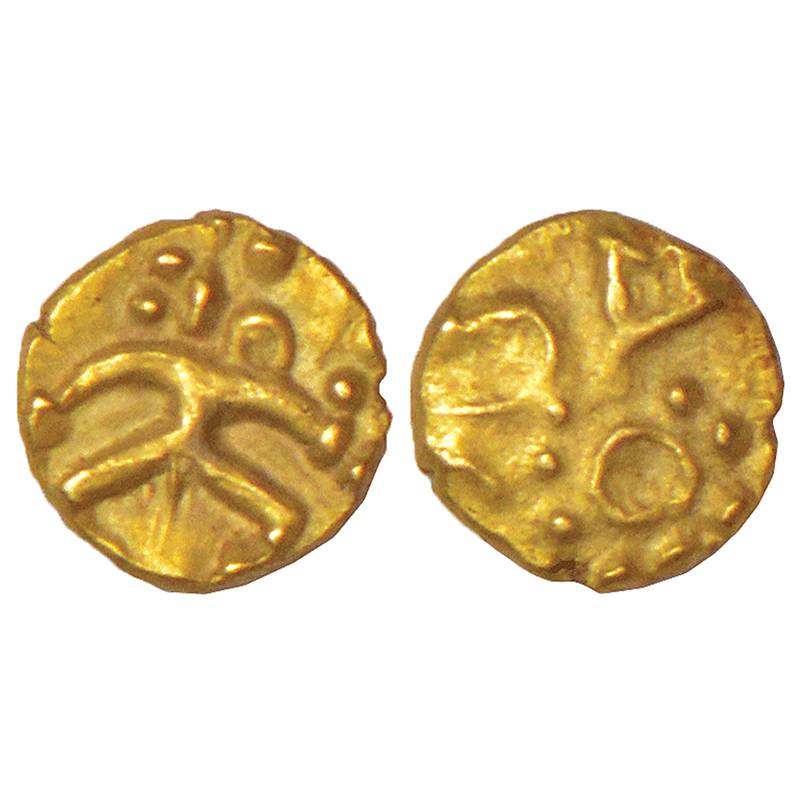 Although it is almost impossible to attribute this coin because it lacks any legends, similar 'temple'-type coins with pseudo-Arabic inscriptions are known, which in turn connect them to the Rashtrakutas. They are most likely issued by coastal feudatories of the imperial dynasty, active in trade with Islamic rulers of the Middle East and therefore are struck to the standard of an Islamic dinar.