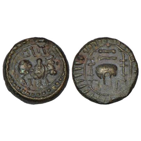 Early Medieval Maharashtra, Khandesh region - 'bull' type alloyed copper coin of 'Vishnukundin' fabric, attributed to 'Kushala'/'Vishala', probably a local Rashtrakuta ruler (c.600-700 AD), 2.55g. Obv: bull standing facing right; Brahmi legend Kushalah / Vishalah above. Rev: Kalasha or vase of plenty between two lamp-posts within a rayed circle.