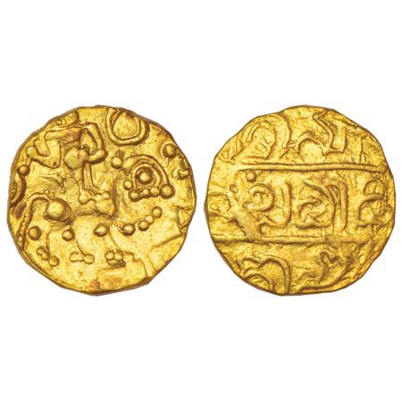 Gahadavalas of Kanuj, base gold 4½ masha of Govinda Chandra Deva (1114-1154 AD), Deyell 145, 4.19g. Obv: Goddess Lakshmi seated facing front. Rev: Devanagari legend Srimad Go/vinda Chandra/deva in three lines.