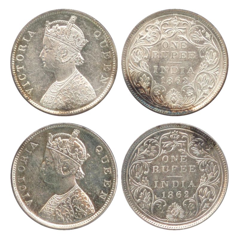 | Victoria Queen, Silver Rupees (2), 1862, Calcutta Mint, B/II(c)/0/0, One pineapple type (PR 54), Bombay Mint, B/II(a)/0/0, 4 Pineapple type (Unlisted in Pridmore). (2 Coins) |