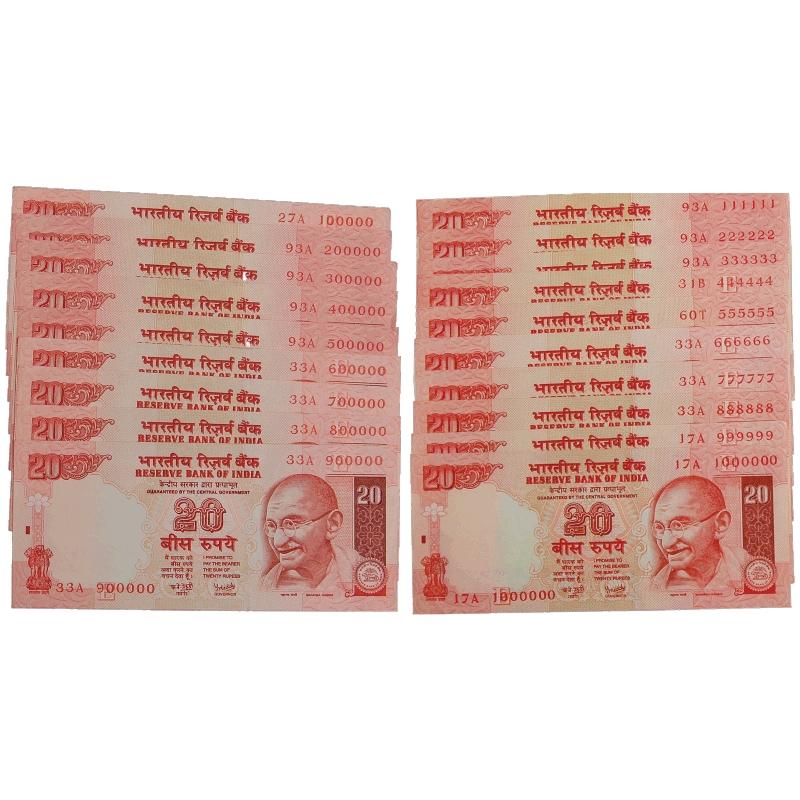 Rupees 20 (19), Sign: Y.V. Reddy, Gandhi series, Fancy Number 100 000 to 900 000 and 111 111 to 100 0000. (19 Notes)