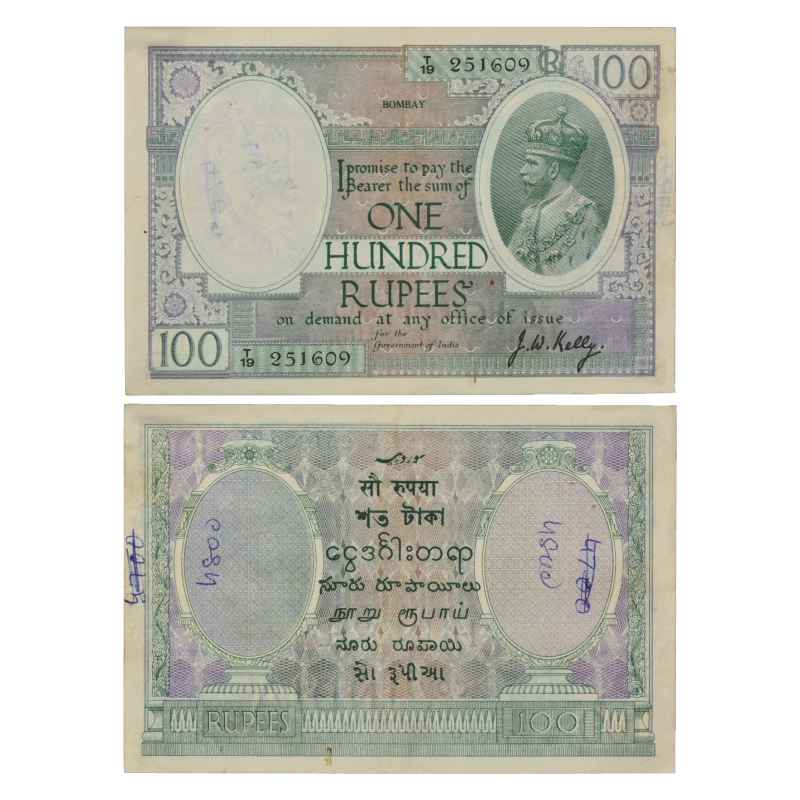 | British India, George V, 100 Rupees, ND (1927), Bombay Circle, signed by J.W. Kelly, Serial No.: T19 251609, Watermark 'Variety 2 type', Printed in Nashik, J&R 3.10.3A. |