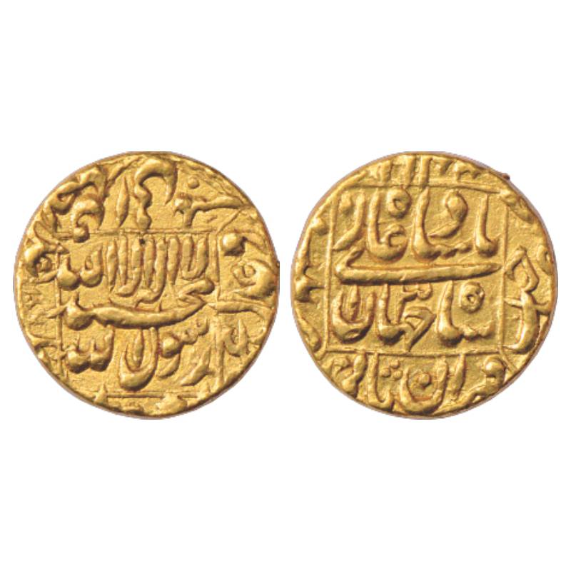 Shah Jahan (1628-1658 AD), Gold Mohur, Patna Mint in left quadrant, RY 13, KM 260.14. Shroff mark on edge.
