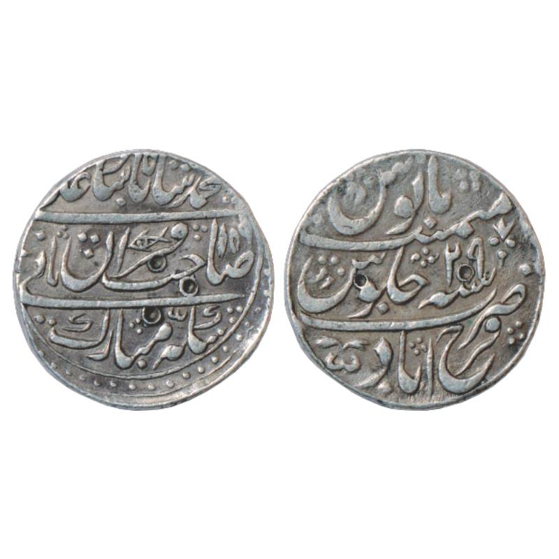 Muhammad Shah (1719-1748 AD), Silver Rupee, Farrukhabad Mint, AH 1x59/RY 29, 'Fish' mint mark on obverse, KM 437.3. Most of the inscription visible.