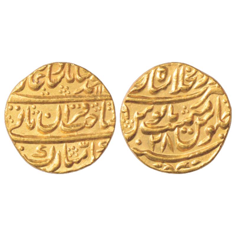 Muhammad Shah (1719-1748 AD), Gold Mohur, 10.83g. Dar ul-Khilafat Shahjahanabad Mint, AH 11xx/RY 28, KM 439.4.