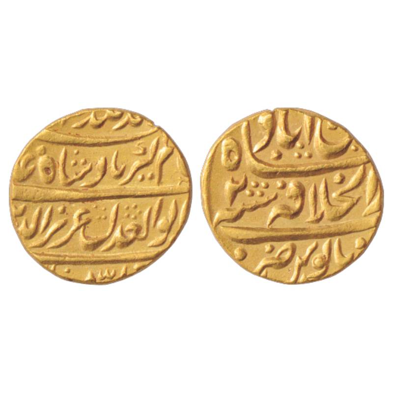 Alamgir II (1754-1759 AD), Gold Mohur, Dar al-Khilafat Shahjahanabad Mint, RY2, with full name of the Emperor including 'Azeez al-Din', his Laqab and 'Abu al-Adl', his Qunyat with the invocation 'Khallada Allah Mulkahuwa Saltanahu' added above it. KM 465.1.