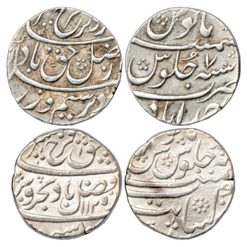Farrukhsiyar (1713-1719 AD), Silver Rupee (2), Ahmadabad Mint, RY 7, KM 377.1 and Khambayat Mint, AH 1125/RY Ahd, KM 377.41. (2 Coins)
