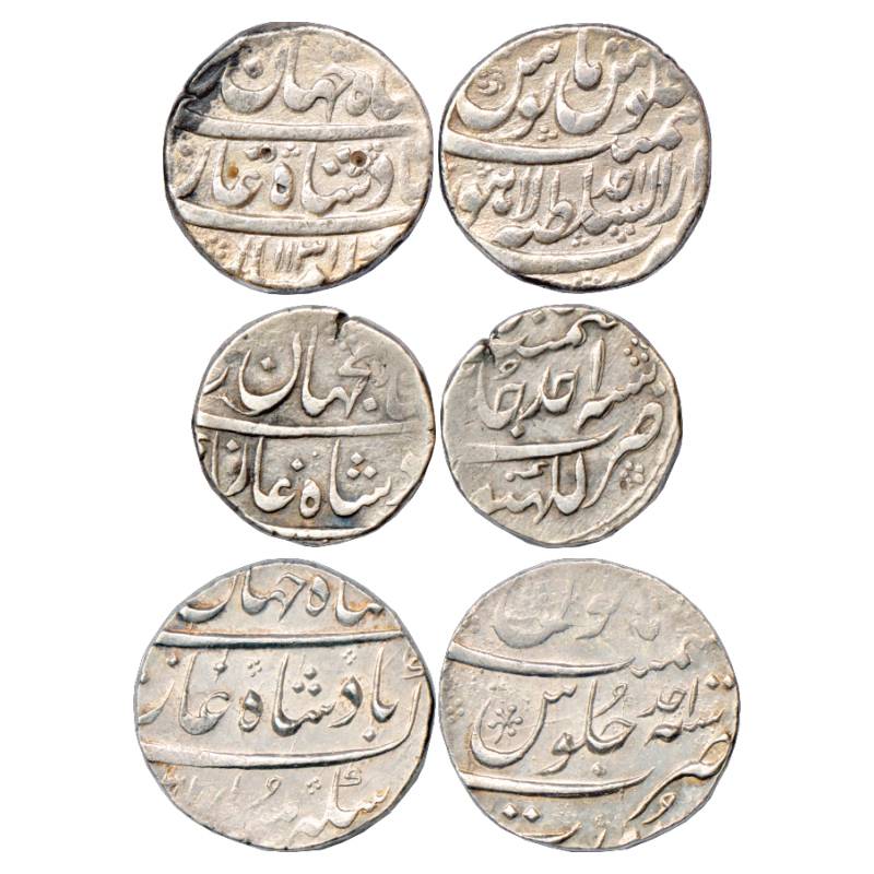 Shah Jahan II (1719 AD), Silver Rupee (3), 1x Dar us-Sultanat Lahore Mint, AH 1131/RY Ahd, 1x Lakhnau Mint, RY Ahd and Surat Mint, AH xx31/RY Ahd. (3 Coins)