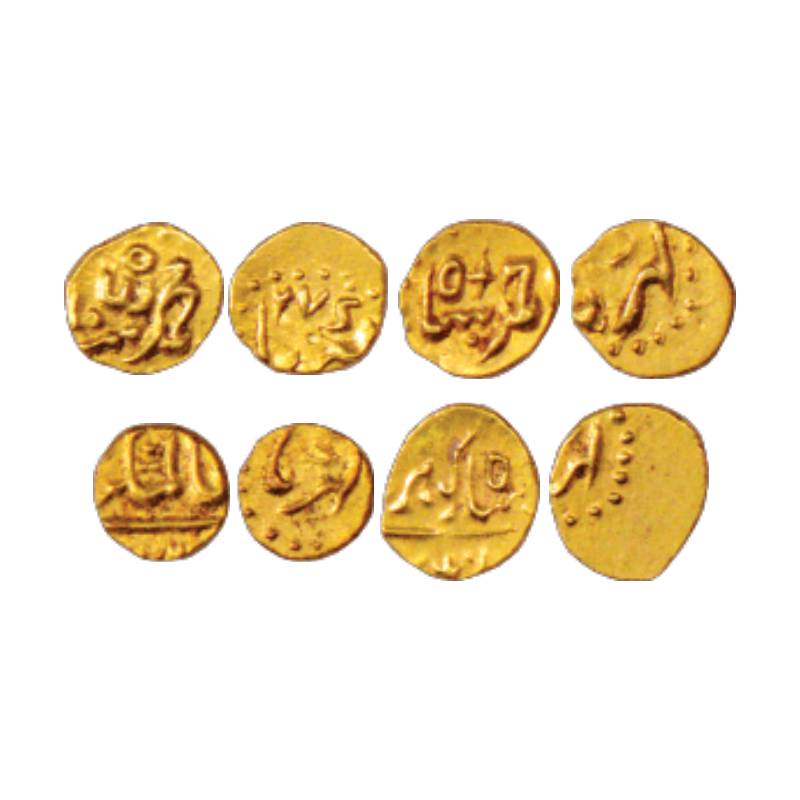 A group of 4 Gold ½ Fanams from Karpa Mint, weighing 0.16g each, 1x Muhammad Shah, 1x Ahmad Shah Bahadur, 1x Alamgir II and 1x Shah Alam II (Shah Gauhar).