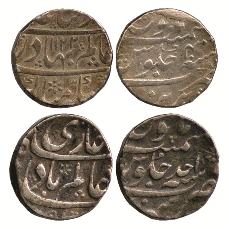 Shah Alam Bahadur (1707-1712 AD), Silver Rupee (2), Purenda Mint, AH 1122 / RY 4, (KM 348.31) and Sahrind Mint, RY Ahd, (KM 347.17). (2 Coins)