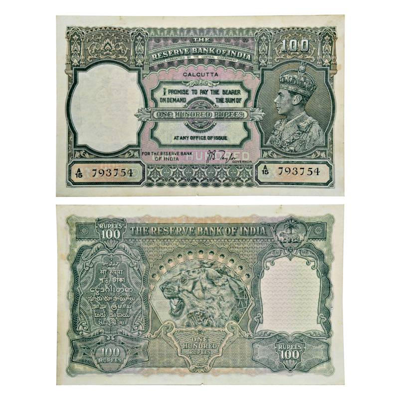 | British India, George VI, 100 Rupees, ND (1938), Calcutta Circle, signed by J.B. Taylor, Serial No.: A15 793754 in black, Watermark 'Profile head', J&R 4.7.1B. |