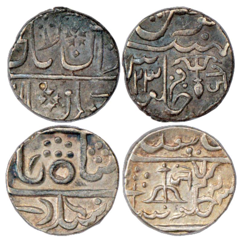 | Gwalior, Jankoji Rao (1827-1843 AD), Silver Rupee (2), (A) Gwalior Fort Mint, in the name of Muhammad Akbar II, Bow and Arrow points down with initial 'Ja' for Jankoji on reverse, and (B) Lashkar Mint, in the name of Shah Alam II, Bow and Arrow points up with initial 'Ja' for Jankoji and trisul mint-mark on reverse, RY 23, KM 72 and 141. Lead deposits. (2 Coins) |