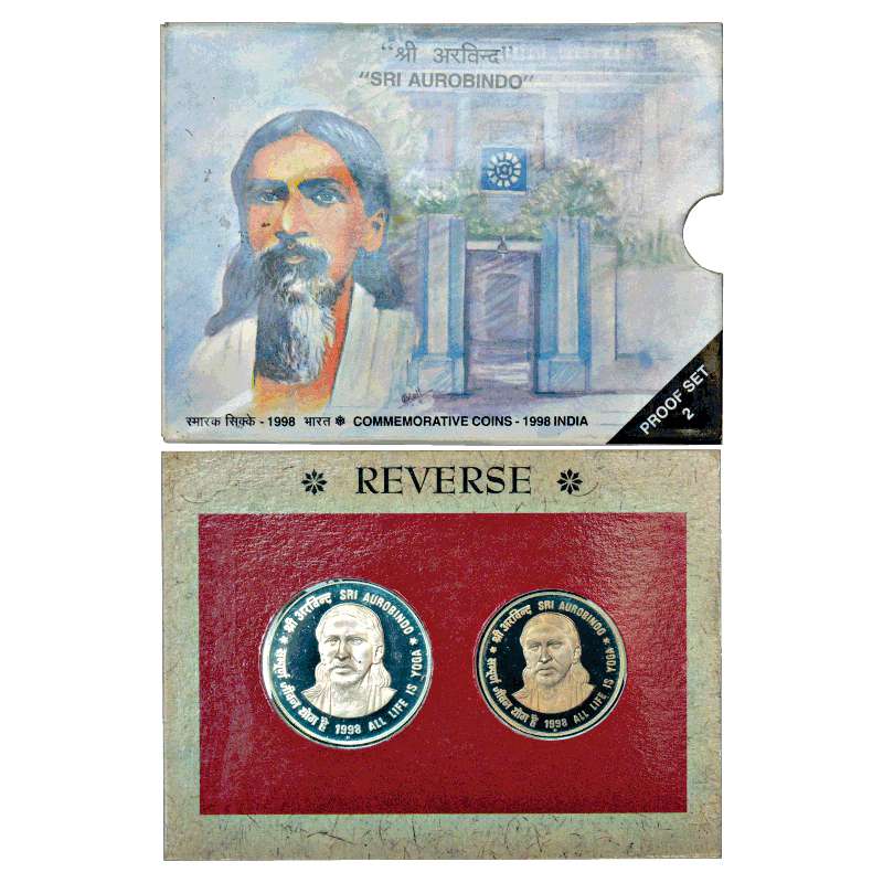 1998, Sri Aurobindo, Proof set of 2 coins, 100 Rupees and 50 Rupees, Mumbai Mint, RB 207, in original mint packing.