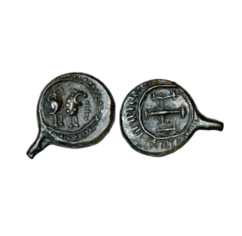 Eastern Chalukyas of Vengi, uninscribed arsenous copper coin modelled on the Vishnukundin 'lion'-ty...