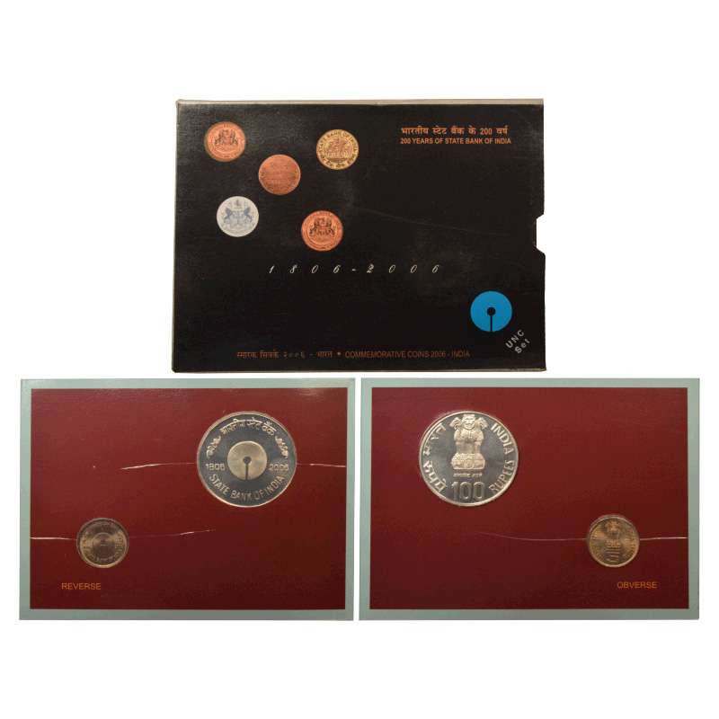 2006, 200 Years of State Bank of India, UNC set of 2 coins, 100 rupees and 5 rupees, Kolkata mint, RB 289, in original mint packing.