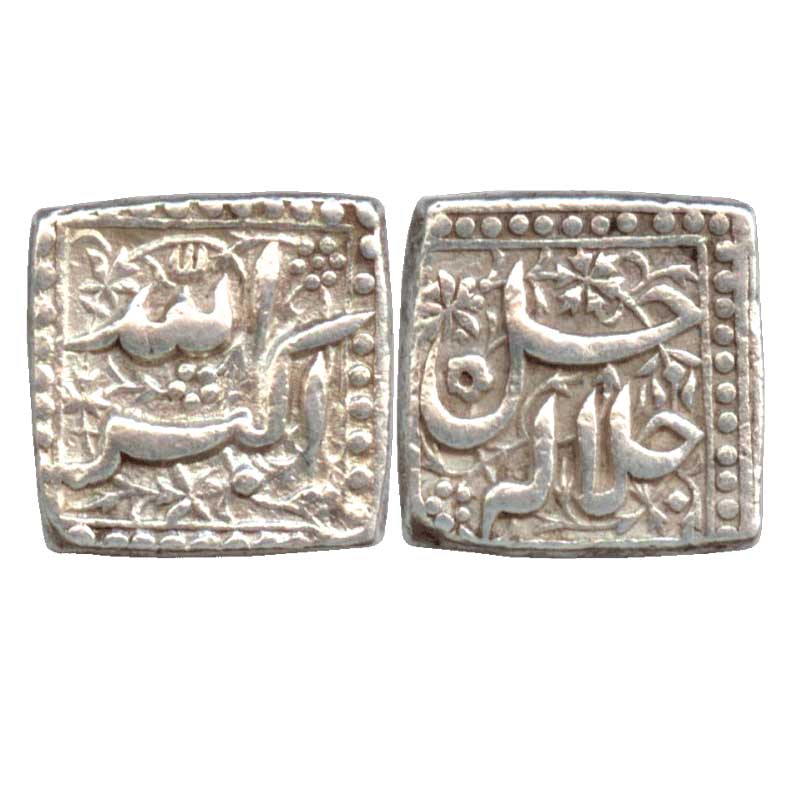 Akbar, Silver Square Rupee, mint-less and date-less type. Obv: Allah Akbar, Rev: Jallu Jalalahu.
