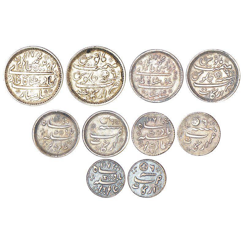 | Madras Presidency, Arkat mint, set of 5 silver coins, 1 rupee, 11.64g, ½ rupee, 5.70g, ¼ rupee, 2.85g, ⅛ rupee, 1.46g and 1/16 rupee, 0.69g, in the name of Alamgir II, AH 1172/RY 6, rose mint-mark on reverse.. (set of 5 coins) |