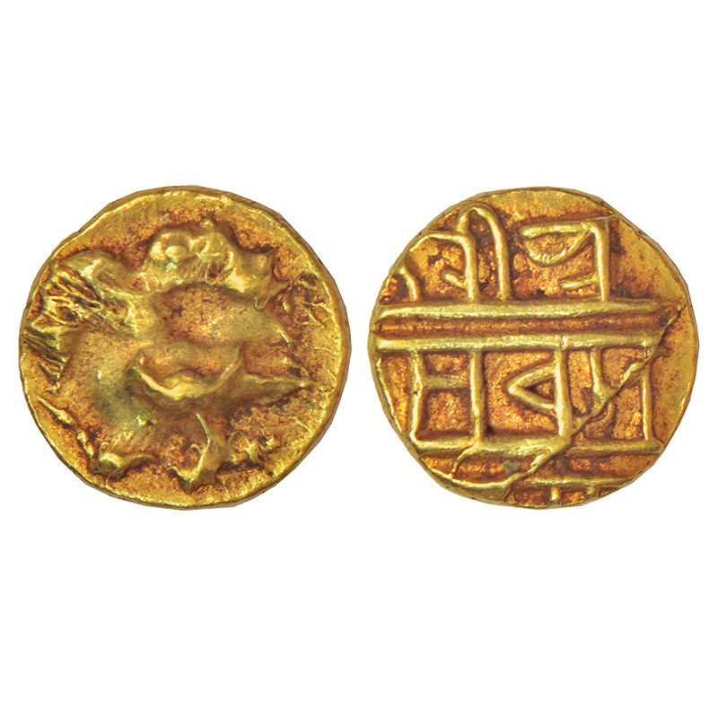 Vijayanagar Kingdom, Tuluva dynasty, gold ½ pagoda of Achyutaraya (1529-1542 AD), MCSI-I 672-673, 1.67g. Obv: Gandabherunda moving left, hold elephant in each beak and each foot. Rev: Devanagari legend Sri pra/tapa Chyuta/raya in three lines.