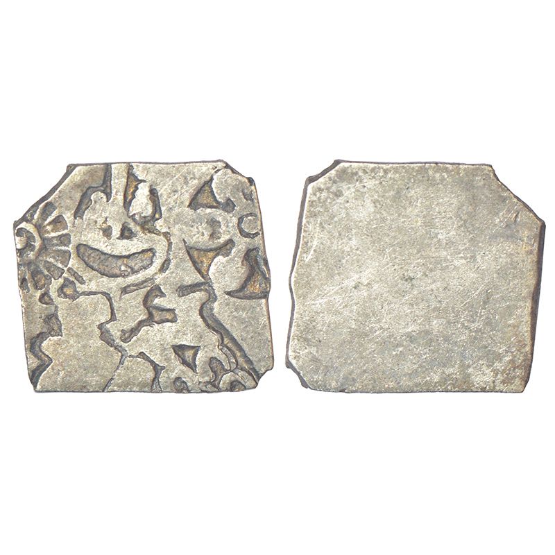 | Imperial Magadhan silver punch-marked Karshapana coin (c.370-320 BC), GH series IVd, no. 428, 3.47g. Obv: Five punches: 1. Sun, 2. Six -armed symbol, 3. Hare over five-arched hill, 4. Bull facing right, 5. Umbrella with taurines. Rev: Plain. |