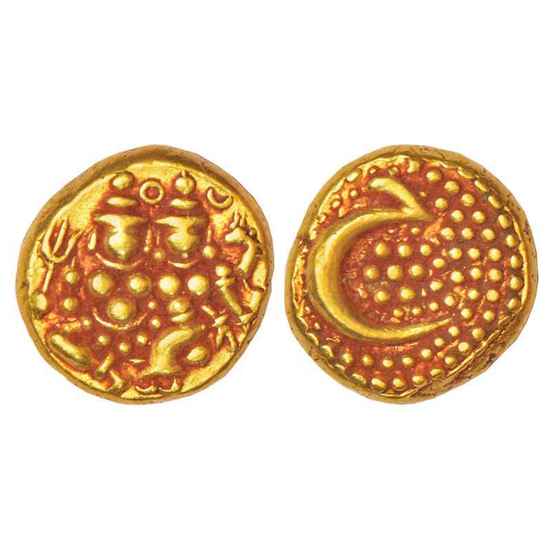 Mysore, gold pagoda of Haidar Ali (1761-1782 AD), KM 15, 3.43g. Obv: Shiva Parvati seated. Rev: Persian letter 'He' for Haidar Ali in granulated field.