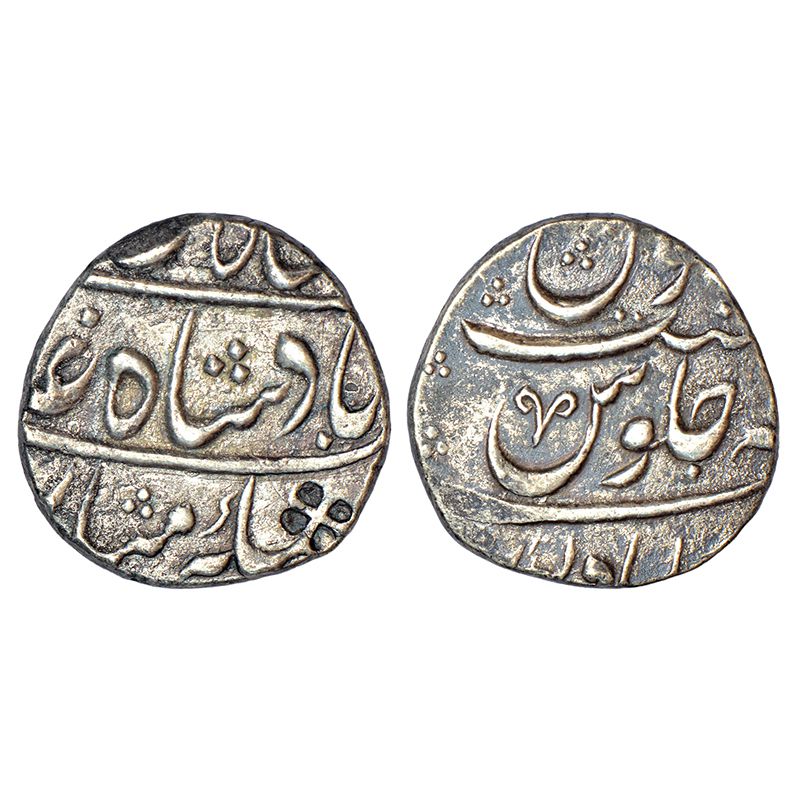Marathi Confederacy, domains of the Peshwas - silver rupee in the name of Shah Alam II, Muhiyabad Poona (Pune) mint, 11.24g. Obv: nominative legend for Shah Alam II. Rev: 'Julus' formula and symbol of '10' as seen on a cobra hood (identified as 'scissors' in older catalogues).