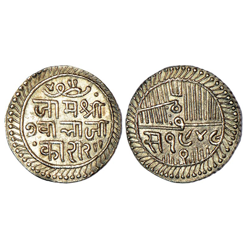 | Nawanagar, Jam Vibhaji (1852-1894 AD), silver 2½ kori, VS 1949, KM 21, 7.06g. Obv: In circle, Jamshri in Devanagari with value and Persian legend Muzaffar Shah at top. Rev: In circle, VS 1949. |