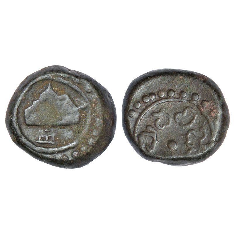 Nayakas of Thanjavur - copper 5-cash coin of Vijaya Raghava Nayaka (1635-1673 AD), probably struck at Thiruvannamalai, unpublished in major sources, 6.27g. Obv: depiction of mount Arunadri. Rev: circular Telugu legend Vi ja… gha va.