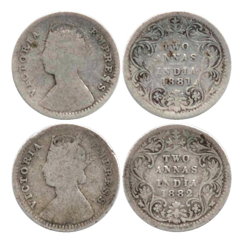 Victoria Empress, Silver Two Annas (2), Calcutta Mint, 1881, B/II/'C' incused. 1882, B/II/'C' incused. (Pr. 496, 497)(2 Coins)
