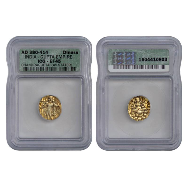 | Gupta Empire, Chandragupta II (c. 375-415AD), Gold Dinar, Archer type, Altekar Class II, variety A. Obv: King standing holding a bow and an arrow, Brahmi legend Chandra under his arm holding the bow and Garuda standard and crescent in left field; Rev: Lakshmi seated on a lotus, holding a noose and lotus in her hands. Tamgha in left field and Brahmi legend Sri Vikrama to the right. |